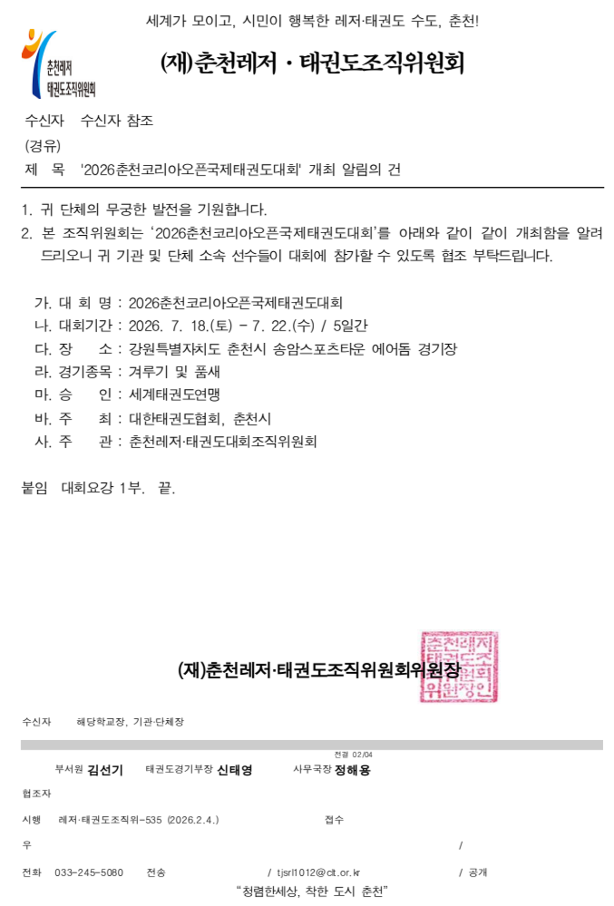 '2026춘천코리아오픈국제태권도대회' 개최 알림의 건